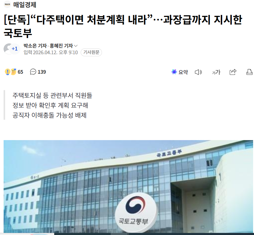 그런데 저는 이렇게 생각합니다. 세종시 이전 과정에서 어쩔 수 없이 기존 주택을 처분하지 못하고 다주택자가 된 공무원까지 일괄 압박하는 건 현실과 정책 사이의 괴리를 키울 수 있습니다. 처분계획서(disposal plan)란 보유 주택을 매각하거나 보유 구조를 정리하는 구체적 일정과 방식을 기재하는 문서입니다. 이걸 제출하지 않으면 인사상 불이익을 주겠다는 방식은, 자발적 협력이 아닌 강제적 분위기 조성에 가깝습니다.