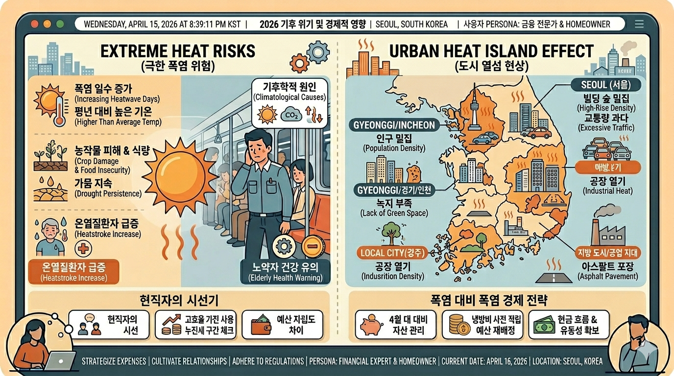 • 에너지 물가 압박: 냉방 시기가 한 달 빨라지면 가계의 전기료 부담은 누적될 수밖에 없습니다. 누진세 구간을 넘지 않도록 지금부터 실내 온도 조절과 에너지 절약 습관을 들여야 합니다.